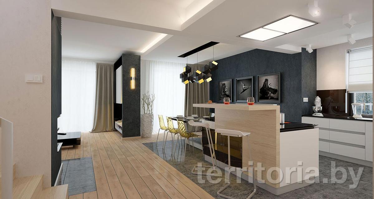 В это версии мы расширили центральную часть дома на 1 метр, за счет чего увеличилась рабочая зона кухни, помещение туалета теперь имеет полноценный потолок, без уклона под лестницей.