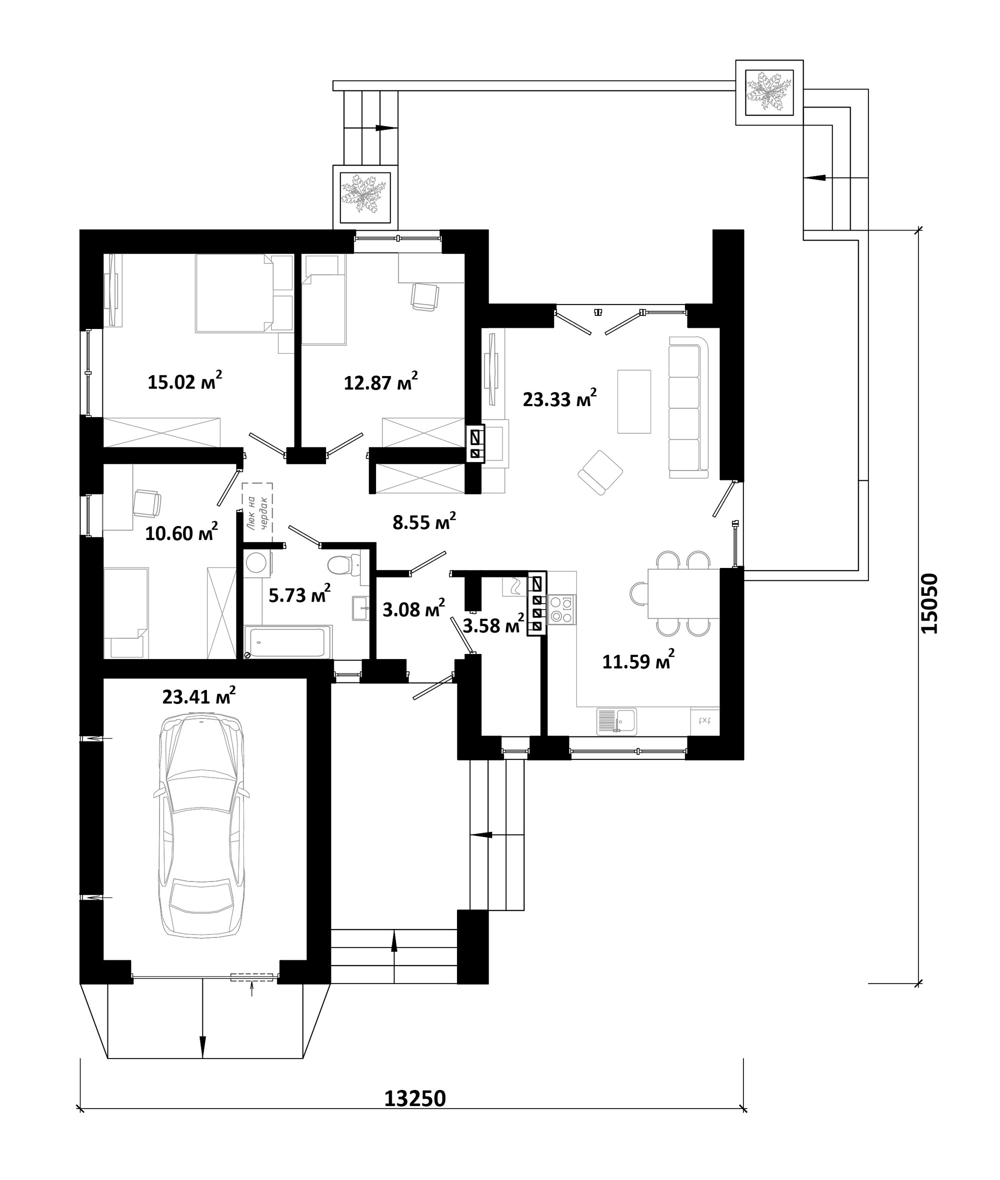 Это дом небольшой площади с тремя спальнями, гостиной, кухней гаражом на одно машино-место. Кроме указанных помещений в доме есть ванная комната и помещение мини-котельной. Из гостиной можно выйти на террасу обрамленную цветниками.